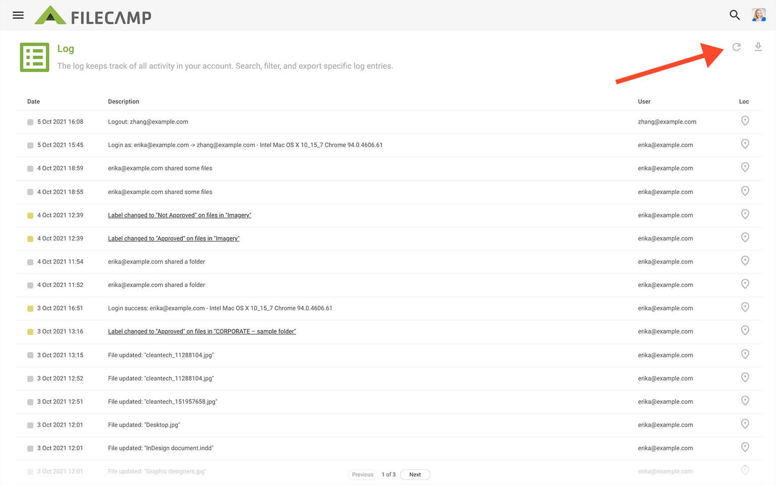 When someone signs in or out of your Filecamp, uploads, downloads or deletes a file, or has been sent a notification via e-mail, the activity will be recorded as an entry in the Log file. Each entry in the Log includes a time and date stamp, username, and an approximate location.