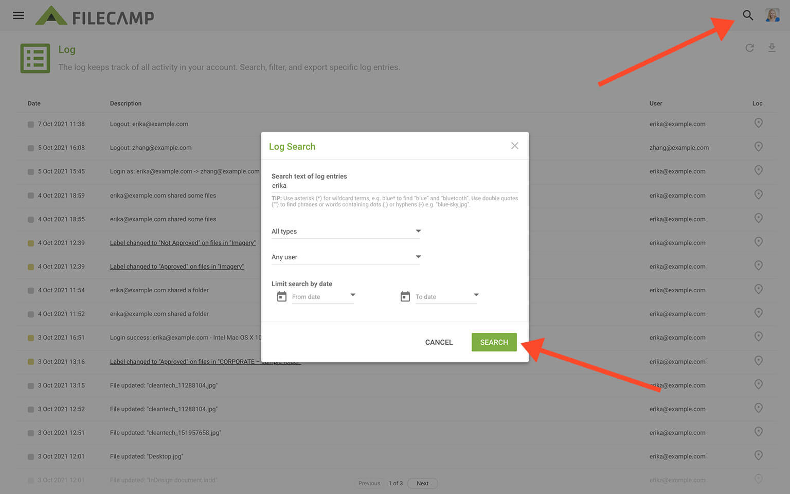 Click on the Search icon and search for specific Log types, User tasks, or define a time period you wish to review more closely. This is useful when you want a more detailed overview of the activity on your account or to view older log entries, you can easily search using the Search log entries function.