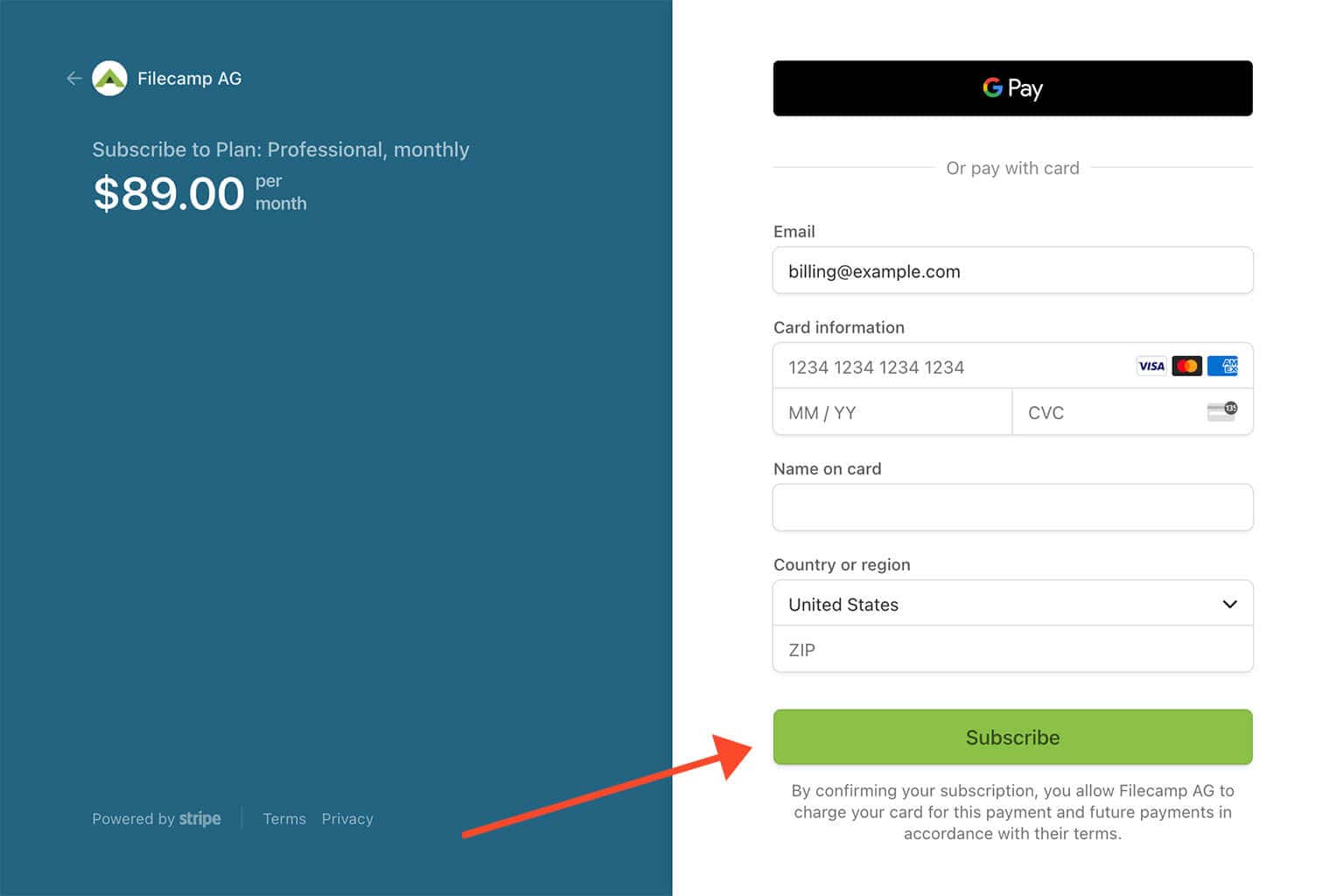 Filecamp only stores the absolute minimum card details such as the last four digits and the expiration date for identification purposes.
