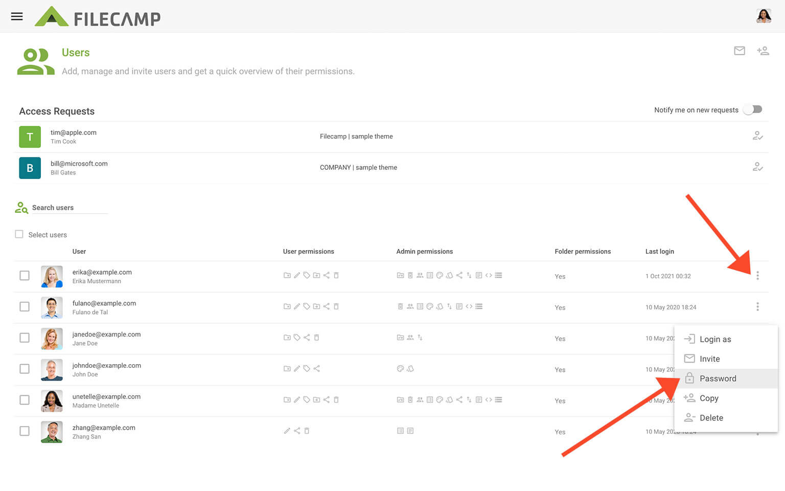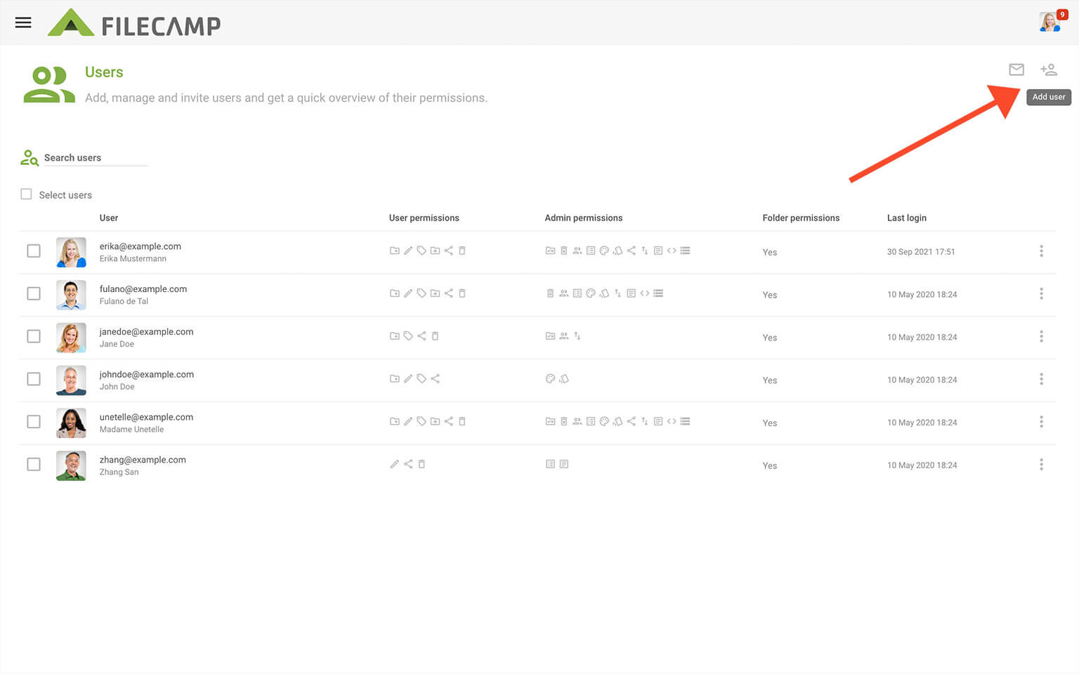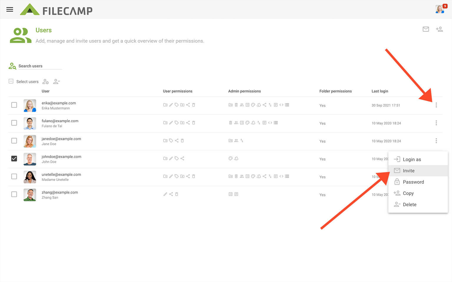 Administrators and users with permission to "Manage users" can add, invite and manage users. You can control folder permissions, ensuring users access only the files and folders you want them to access.
