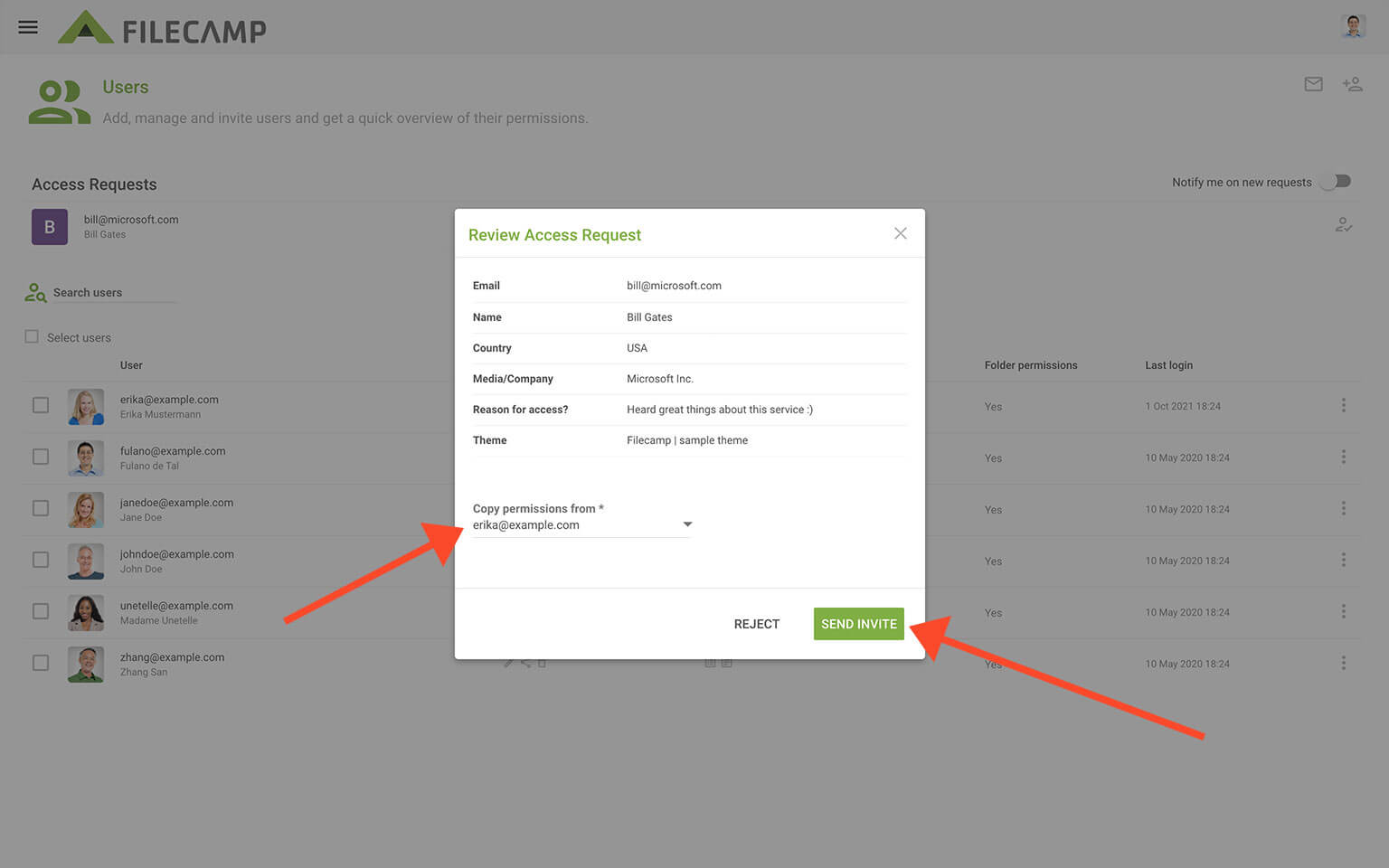 Bulk add & Invite users is a great way to automate access for a whole bunch of people in one go, but fails to handle ongoing access requests from your external partners. Filecamp's Access Requests feature (Pro plan only) relieves some of the headaches for dealing with such requests.